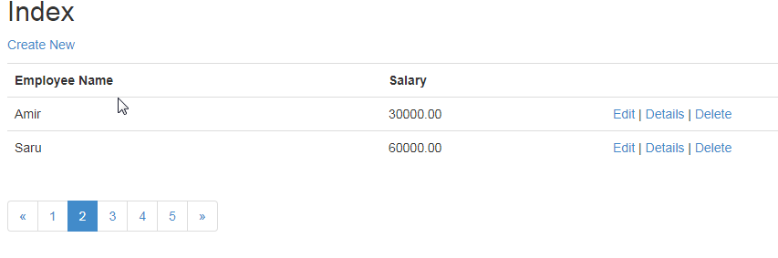 @using PagedList @using PagedList.Mvc @model IPagedList<PagingInMVC.Models.tbl_Employee> <table class="table"> <tr> <th> Employee Name </th> <th> Salary </th> <th></th> </tr> @foreach (var item in Model) { <tr> <td> @Html.DisplayFor(modelItem => item.EmployeeName) </td> <td> @Html.DisplayFor(modelItem => item.Salary) </td> <td> @Html.ActionLink("Edit", "Edit", new { id = item.EmpID }) | @Html.ActionLink("Details", "Details", new { id = item.EmpID }) | @Html.ActionLink("Delete", "Delete", new { id = item.EmpID }) </td> </tr> } </table> @Html.PagedListPager(Model, page => Url.Action("Index", new { page=page}),PagedListRenderOptions.EnableUnobtrusiveAjaxReplacing(new AjaxOptions() {HttpMethod="GET",UpdateTargetId= "employee-grid" }))